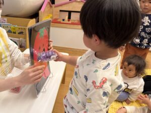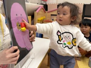 みんなの前に出るのがちょっぴり恥ずかしくて、保育士の膝の上でインタビューを受けました🎤