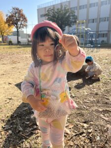 お散歩バッグを持って、見つけたどんぐりを大事そうにしまっていた子どもたち😊