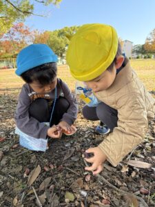 お散歩バッグを持って、見つけたどんぐりを大事そうにしまっていた子どもたち😊