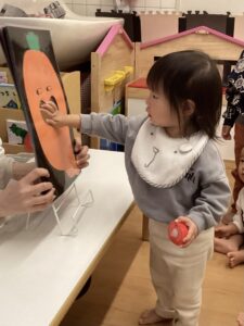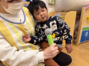 みんなの前に出るのがちょっぴり恥ずかしくて、保育士の膝の上でインタビューを受けました🎤