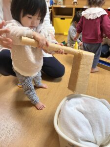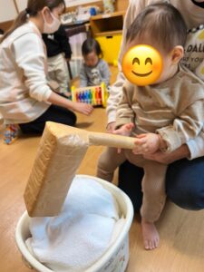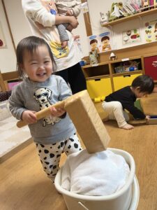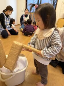 朝の会でもちつきのうたを歌っていたので、みんな「ペッタン ペッタン」と