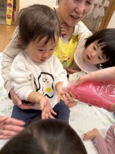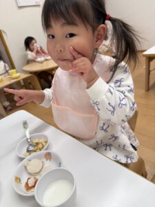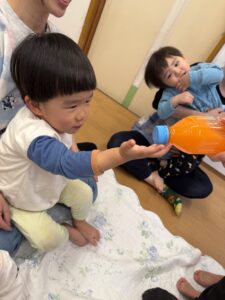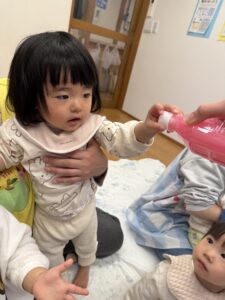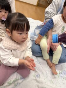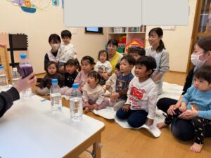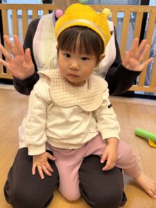みんなの前に出るのがちょっぴり恥ずかしくて、保育士の膝の上でインタビューを受けました🎤